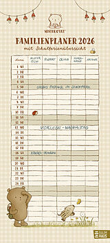 Am liebsten verbringt Mister O'Lui seine Zeit mit dem Streifenschwein Rupert und seinen anderen Freunden - da kann man schon mal den Überblick über die vielen Verabredungen verlieren. Dank dieses zauberhaften Familienplaners ist die Alltags-Organisation leichter und übersichtlicher denn je. Ob Playdates, Geburtstage, anstehende Arzttermine oder Mamas Mädelsabend - kein Termin wird mehr vergessen. Die warmherzigen Illustrationen versüßen der ganzen Familie jeden Monat! Rundum organisiert: In fünf Spalten gibt es genug Platz für alle Pläne und Termine auf einen Blick Inklusive Schulferien-Übersicht, Stundenplänen und 3-Monats-Vorschau bis März 2027