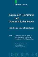 Roman Jakobson's 'Poetry of Grammar and Grammar of Poetry' (1981), that monumental work of his later years, together with its later additions, was and is a theoretical challenge both for General and Comparative Literature and for the study of individual literatures. However, the sovereign multilinguality of these linguistic analyses of poetry has not only resulted in their being received world-wide, but has also presented a seemingly insurmountable difficulty, as there is hardly a reader who is able to understand them all, let alone discuss them critically. To remedy this situation no more and no less is the objective of this German edition of all of Jakobson's structuralist analyses of poems and his most important poetological essays, which have been translated and commentated by specialists from the appropriate areas of literary studies.