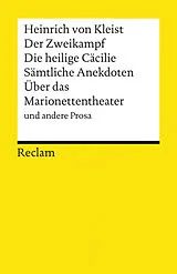 Der Band enthält neben Heinrich von Kleists Erzählungen 'Der Zweikampf' und 'Die heilige Cäcilie oder die Gewalt der Musik' auch sämtliche Anekdoten, die beiden Fabeln 'Die Hunde und der Vogel' und 'Die Fabel ohne Moral' sowie die Aufsätze 'Über das Marionettentheater' und 'Über die allmähliche Verfertigung der Gedanken beim Reden' Text in neuer Rechtschreibung. Mit Anmerkungen von Christine Ruhrberg.