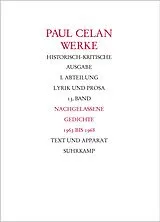 Band 13 der historisch-kritischen Ausgabe der Werke Paul Celans bietet die nachgelassenen Gedichte und die Gedichtbruchstücke der Jahre 1963 bis 1968 mit Ausnahme des 1966 entstandenen Projekts "Eingedunkelt", das bereits in Band 12 ediert wurde. Die Texte sind auch hier, der Folge von Celans Gedichtbänden entsprechend, nach Werkphasen geordnet. Die umfangreichste Gedichtgruppe stellen die 43 ursprünglich zum Bestand "Schneepart" gehörenden Texte dar, die vom Autor selbst schon aus dem Zusammenhang der Sammlung, der Grundlage für den 1971 postum erschienenen Gedichtband "Schneepart", ausgeschlossen wurden. Erstmals publiziert wird im folgenden Teil des Bandes unter dem Titel Projekt Nachtstück ein Aufzeichnungszusammenhang Celans von 1966, der bislang nur nachrichtlich bekannt war. Die historisch-kritische Bonner Ausgabe (BCA) ist die maßgebliche Edition aller Werke Paul Celans einschließlich ihrer sämtlichen Vorstufen. Die erste Abteilung, Lyrik und Prosa, ist auf 16 Bände angelegt. Mit Band 13 der historisch-kritischen Ausgabe liegt Celans (deutschsprachige) Lyrik in vierzehn Bänden abgeschlossen vor. Die beiden letzten Bände der Bonner Ausgabe mit Celans Prosa (Bände 15 und 16) erscheinen gemeinsam ca. 2013.