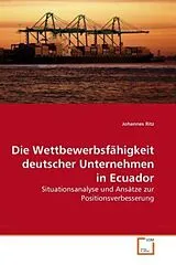 Das vorliegende Buch richtet sich insbesondere an Führungskräfte in Lateinamerika, aber auch an alle, die sich für die Themen Wettbewerbsfähigkeit, Direktinvestitionen, Internationalisierungs- und Markteintrittsstrategien, sowie die Tätigkeit deutscher Unternehmen im Ausland allgemein interessieren. Es basiert auf einer 2009 in Kooperation mit der Deutsch-Ecuadorianischen Industrie- und Handelskammer durchgeführten Studie. Zielsetzung war die Untersuchung der Wettbewerbsfähigkeit deutscher Unternehmen im ecuadorianischen Markt. Hierzu wurden verschiedene Analysen durchgeführt, unter anderem der komparativen Vorteile, des Wettbewerbsumfeldes, der Importe Ecuadors (Struktur, Herkunft,Entwicklung) sowie der politischen Rahmenbedingungen. Ebenso wurden eine Bestandsaufnahme der deutschen Unternehmen und ein Vergleich der Markteintrittsformen vorgenommen, sowie Schlüsselbranchen identifiziert. Des Weiteren wurden Experten auf Ebene der Geschäftsführung vor Ort tätiger deutscher Unternehmen befragt. Aufbauend auf den Ergebnissen wurden Handlungsoptionen zur Situationsverbesserung abgeleitet. Mehr unter: www.johannesritz.de und www.ecuadoradvisor.com