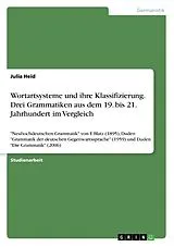 Studienarbeit aus dem Jahr 2014 im Fachbereich Germanistik - Linguistik, Note: 1,3, Universität Trier, Sprache: Deutsch, Abstract: In der Arbeit sollen drei verschiedene Grammatiken aus unterschiedlichen Jahrhunderten hinsichtlich ihrer Klassifikation der Wortarten beziehungsweise ihrer Wortartensysteme gegenübergestellt werden. Die Kriterienzuordnung orientiert sich an einem Artikel "Kriterien für die Definition von Wortarten" von Knobloch und Schaeder.Anhand der "Neuhochdeutschen Grammatik" von Friedrich Blatz von 1895 als Stellvertreter des neunzehnten Jahrhunderts, der Duden "Grammatik der deutschen Gegenwartssprache" von 1959 als Vertreter des zwanzigsten Jahrhunderts und der Duden "Die Grammatik" von 2006 als Vertreter des einundzwanzigsten Jahrhunderts wird ein Vergleich angestellt, der die Gemeinsamkeiten und Unterschiede herausstellt und einzelne Probleme der Wortartenklassifizierung hervorbringt. Zunächst wird die Grammatik von Friedrich Blatz beschrieben und kommentiert. Im zweiten Schritt sollen dann die Blatz Grammatik und die Duden Grammatik von 1959 miteinander verglichen werden. Als letztes schließlich wird die Entwicklung von dem in der Blatz Grammatik beschriebenen Wortartsystem zur Sichtweise der deutschen Einheitsgrammatik von 2006 gezeigt. In einem Schluss können schließlich nochmals die wichtigsten Unterscheidungen nachgelesen werden und es wird ein allgemeines Fazit des Vergleichs der drei Grammatiken untereinander gezogen.So wie in vielen anderen Sprachen, wie zum Beispiel im Französischen, Englischen oder Spanischen, wird auch im Deutschen schon seit Jahrhunderten von Linguisten und ihren "forschenden Vorgängern", beispielsweise Platon, Aristoteles und vielen mehr, versucht, ein angemessenes Wortartsystem zu finden. Dieses Wortartsystem soll die Sprache entweder schulgrammatisch beschreiben, sie für das Erlernen der deutschen Sprache als Fremdsprache gliedern, Grundlage einer linguistischen Theorie bilden, oder einen von vielen weiteren Zwecken erfüllen. Jedoch sind in den als universell anerkannten Grammatiken einer Generation auch die unterschiedlichen Wortartsysteme genauso unterschiedlich wie die aufgelisteten Zwecke einer Wortartklassifizierung. Jedes Jahrhundert unterscheidet sich in mindestens einem Punkt seiner Universalgrammatik des Deutschen von seinem Vorgänger. Dieser Umstand zeigt, dass Sprache nicht festgelegt ist sondern in sich beweglich. Es findet eine Entwicklung statt, die sich durch ständige Reflektion bestehender Theorien auszeichnet und sich auch darin begründet.