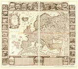 Nachdruck. Die Karte wurde auf einem Blatt je zur Hälfte doppelseitig bedruckt (vorn und hinten). Lieferung gerollt, Blattgröße (B x H) 60 x 94 cm, Maßstab: 1: 5 700 000. Kartograf: Jean Baptiste Nolin (1686-1762). Die Karte erschien erstmals um 1740 in Paris. Texte auf dem Blatt in Französisch. Europa nach dem Siebenjährigen Krieg (1756 bis 1763). [Lieferung in einer sehr stabilen Versandhülse aus Pappe - bis 72 cm lang - 25 g] KARTUSCHENINSCHRIFT: "L'Europe : Dreßée Sur les Nouvelles observations faites en toutes les parties de la Terre Rectifiée Par Mrs. de lÁcademie Royale des Sciences Divisée En tous ses Royaumes et Etats Subdivisée en leurs principales parties; Dediee et Prefentee AU ROY; avec Privilege du Roi / Par I. B. Nolin. Paris : Crepy, 1767." ÜBER DIE KARTE (Text von 1738): "Europa errichtet auf den neuen Beobachtungen, die in allen Teilen der Erde gemacht wurden und von Mrs. der Königlichen Akademie der Wissenschaften. Unterteilt in alle seine Königreiche und Staaten, die in ihre Hauptteile unterteilt sind, die Seiner christlichsten Majestät Ludwig dem Großen gewidmet und von seinem sehr bescheidenen und sehr gehorsamen Diener und treuen Untertanen Nolin, dem Geographen, Seiner Majestät in Paris, dem Sohn des gewöhnlichen Geographen, überreicht wurden Autor St.-Jacques am Schild des Place des Victoires mit Privileg des Königs 1738." Die Karte wird mit 30 Bildern umrahmt. Sie zeigen: BILDER OBEN MIT 9 BILDERN: (Linke Hälfte) Gründung von Rom; Ankunft von Aeneas in Italien; Die Stadt Athen; Erstes Königreich in Europa. (Mitte) Monarchie von Spanien im Haus Frankreich (Rechte Hälfte) Aus der Regierungszeit Ludwigs des Großen; Die Republik Holland; Die Einnahme von Konstantinopel durch die Türken; Von den 13 Schweizer Kantonen LINKE SEITE MIT 9 BILDERN: Ende des Senats und Beginn der römischen Kaiser; Erster Triumph und Gründung der Kirche in Rom; Sieg von Konstantin; Gründung von Konstantinopel; Plünderung Roms durch den westgotische Krieger unter Alarich 410; Beginn der französischen Monarchie; des Königreichs Schottland; UNTEN MIT 3 BILDERN: Die Republik Venedig; Batesmus von Clovis; das Königreich Lombardei. RECHTE SEITE MIT 9 BILDERN: Einrichtung des Wahlkollegium; Erstes Konklave der Kardinäle; des Königreichs Dänemark; des Königreichs Spanien; aus Moskau; aus Polen; Schweden; Von den Königreichen Englands; Karl der Große König von Frankreich
