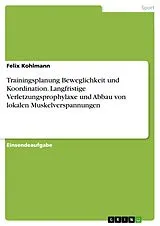 Einsendeaufgabe aus dem Jahr 2019 im Fachbereich Gesundheit - Sport - Sportökonomie, Sportmanagement, Note: 2,4, Deutsche Hochschule für Prävention und Gesundheitsmanagement GmbH, Sprache: Deutsch, Abstract: Diese Arbeit stellt eine Trainingsplanung zur Beweglichkeit und Koordination vor. Mit diesem Training soll eine langfristige Verletzungsprophylaxe und der Abbau von lokalen Muskelverspannungen erreicht werden. Durch das zehnminütige Aufwärmen, wird nicht nur das Herz-Kreislauf- und Atmungssystem aktiviert, sondern auch die Muskulatur auf bevorstehende Belastungen besser vorbereitet. Ebenso kann durch die leichte Vorbelastung das Verletzungsrisiko gemindert werden. Sowohl bei der Reihenfolge als auch bei der Auswahl der Übungen wurden die Trainingsmotive, der allgemeine Gesundheitszustand und vor allem auch der Beweglichkeitstest berücksichtigt.