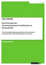 Aufgrund verschiedener strahlungsphysikalischer Mechanismen ergeben sich global divergierende Energiedichten der Solarstrahlung. Ferner bewirken diese eine Aufspaltung der Globalstrahlung in direktes und diffuses Licht. Da in Deutschland die Direktstrahlung relativ gering ist, eignet sich hierzulande vorwiegend die nicht-konzentrierende Solarthermie. Die nicht-konzentrierende Solarthermie umfasst ein breites Spektrum an Anwendungsmöglichkeiten im Niedertemperaturbereich. In Deutschland wird sie derzeit vorwiegend zum Beheizen von Freibädern und für die Warmwasserbereitung und Heizungsunterstützung von Ein- und Mehrfamilienhäusern genutzt. Die Anwendung in diesem Bereich lässt sich jedoch stark ausbauen; zumal ein Großteil des Heizungsbestands mit niedrigen Wirkungsgraden sehr veraltet ist und sich durch solarthermische Anlagen ersetzen ließe. Für die Solarthermie bestehen große Potenziale in der Versorgung von solaren Nahwärmesystemen, in der Bereitstellung von Wärme für Industrieprozesse und im solaren Kühlen. Die Technologien für diese Anwendungsgebiete befinden sich allerdings noch in der Entwicklungs- und am Anfang der Markteinführungsphase. Die Entwicklung der Systemtechnik sowie die Verwendung neuer Materialien, Werkstoffe und spezieller Beschichtungen für die Kollektoren, eröffnen ein Potenzial zur Steigerung der Effizienz von solarthermischen Anlagen. Gleichzeitig erschließen sich damit neue Anwendungsgebiete, wie die solarthermische Prozesswärmebereitstellung und das solare Kühlen. Staatliche Förder- und Anreizsysteme sowie die gesellschaftliche Akzeptanz gegenüber der Solarthermie sind für den Erfolg dieser Technologie in Deutschland maßgebende Faktoren. Die finanzielle Förderung von Bund und Ländern ist notwendig, um die Kostenunterschiede gegenüber der herkömmlichen Energiebereitstellung auszugleichen und die Forschung und Entwicklung voranzutreiben. Die dabei bestehenden Interessenkonflikte müssen bei der Verfolgung energiepolitischer Ziele beseitigt und unverkennbare Mängel der staatlichen Steuerungsinstrumente behoben werden. Grundsätzlich ist eine zunehmende gesellschaftliche Akzeptanz gegenüber den erneuerbaren Energien zu erkennen. Dennoch müssen Vorurteile und Informationsdefizite in der breiten Gesellschaft abgebaut werden, um die Motive für eine aktive Nutzung der regenerativen Energien zu stärken.